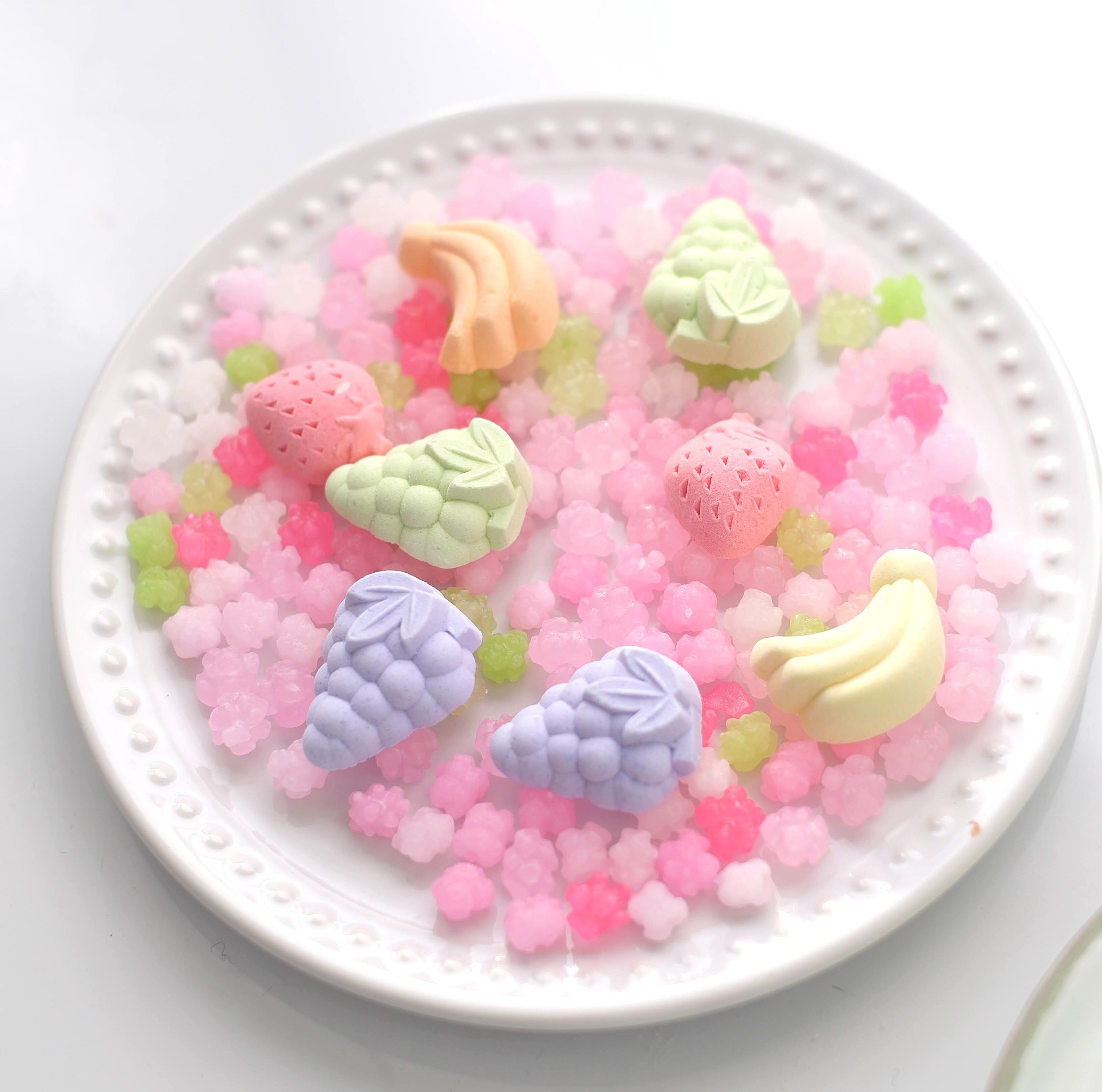 砂糖(国内製造)、コンスターチ、和三盆糖、葛粉、水飴/酸味料、香料、着色料(赤102、赤106、赤3、黄4、黄5、青1)※本製品工場では卵、乳成分、小麦を含む製品を製造しております。(特定原材料)