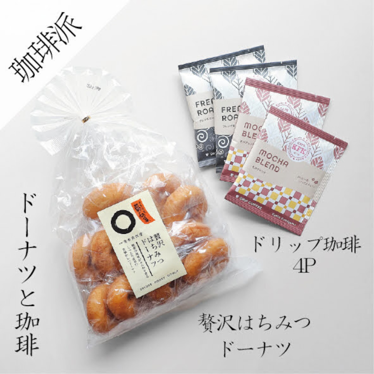 ■贅沢はちみつドーナツ:小麦粉(国内製造)、砂糖、卵、植物油脂、ショートニング、水飴、加糖練乳、蜂蜜、ぶどう糖、食塩/トレハロース、ソルビット、加工でんぷん、膨張剤、香料、乳化剤(大豆由来)※蜂蜜を使用していますので、1歳未満の乳児には与えないでください。■ドリップコーヒー:【フレンチロースト】コロンビア産、ブラジル、他 【モカブレンド】エチオピア、コロンビア、他
