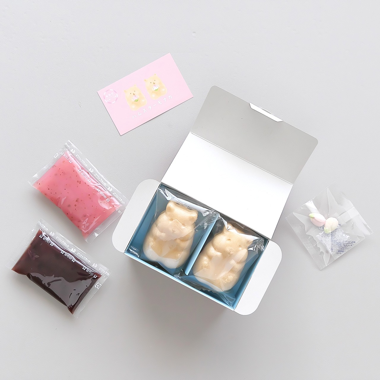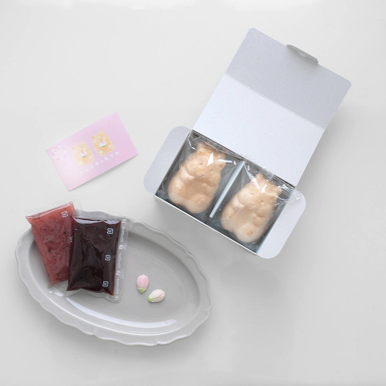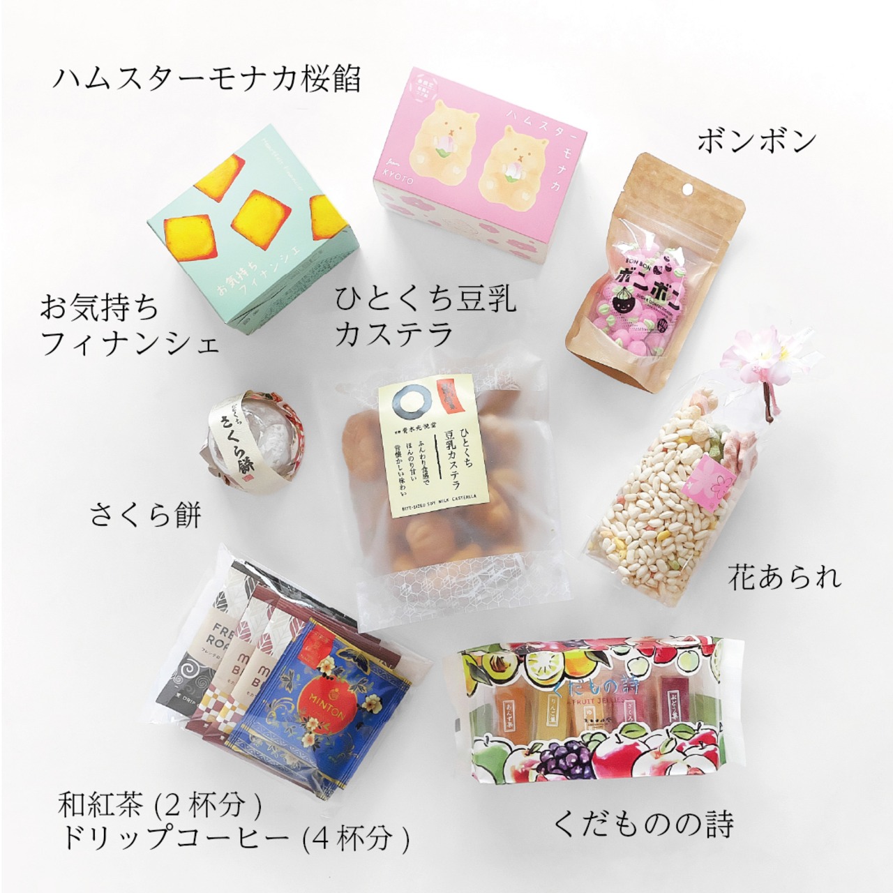 ■ハムスターモナカ春限定 2個入(桜餡・つぶ餡):◆最中種 もち米(富山県、石川産)◆桜餡 白生あん(国内製造)、砂糖、還元水飴、桜葉塩漬、リキュール、寒天/グリシン、ミョウバン、pH調整剤、酸味料、着色料(赤106、赤3)、香料◆北海粒餡 砂糖(国内製造)、小豆(北海道産)/グリシン◆らくがん 和三盆糖(国内製造)、上白糖、寒梅粉ミックス(もち米、ワキスターチ、コーンスターチ)、馬鈴薯澱粉/ソルビトール、着色料(ラック、黄4、青1)※原材料に小麦粉は使用しておりません。本製品の製造工場では、卵、小麦、そば、落花生、乳成分を使用した製品を製造しております。 ■花あられ:もち米(国内産)、うるち米(国内産)、砂糖、醤油(小麦・大豆を含む)、抹茶、桜葉、粉末、食塩/着色料(クチナシ、紅麹、パプリカ色素、紅花色素)※本製品の製造工場ではえび・かに・そば・ごまを含む製品を製造しています。 ■ひとくちさくら餅:砂糖(国内製造)、小豆、餅粉、水飴、桜葉、コーンスターチ、食塩/トレハロース、加工澱粉、乳化剤、野菜色素、pH調整剤、(一部に大豆を含む) ■ミニいちごボンボン:砂糖(国内製造)、卵白/香料、着色料(赤106、黄4、青1) ■くだもの詩 :水飴(国内製造)、砂糖、果汁(りんご、ぶどう、いちご、もも、うめ、ざくろ、あんず、ゆず)、粉末オブラート(でん粉)/ゲル化剤(ペクチン)、酸味料、香料、着色料(アカキャベツ、紅花黄、紅麹、くちなし)、レシチン(大豆由来) ※本製品は小麦・乳・卵を含む製品と共通の設備で製造しております。 ■ひとくち豆乳かすてら :鶏卵(国産)、小麦粉、砂糖、食用植物油脂、豆乳、水あめ、マーガリン、こんにゃく粉、油脂加工食品、食用風味油/加工でん粉、膨張剤、乳化剤、香料、着色料(カロテン)、(一部に小麦・卵・乳成分・大豆を含む) ※本製造工場ではバナナを含む製品を製造しております。 ※まれに製品表面に原料の黒い焦げがついている場合があります。 ■お気持ちフィナンシェ:鶏卵(国産)、グラニュー糖、マーガリン、小麦粉、アーモンドパウダー、コーンスターチ、麦芽糖、還元水飴、食用植物油脂/加工でん紛、膨張剤、乳化剤、香料、着色料(カロテン)、(一部に小麦・卵・乳成分・アーモンド・大豆を含む) ■ドリップコーヒー:【フレンチロースト】コロンビア産、ブラジル、他 【モカブレンド】エチオピア、コロンビア、他 ■京の和紅茶 京 (みやこ):紅茶(京都産)