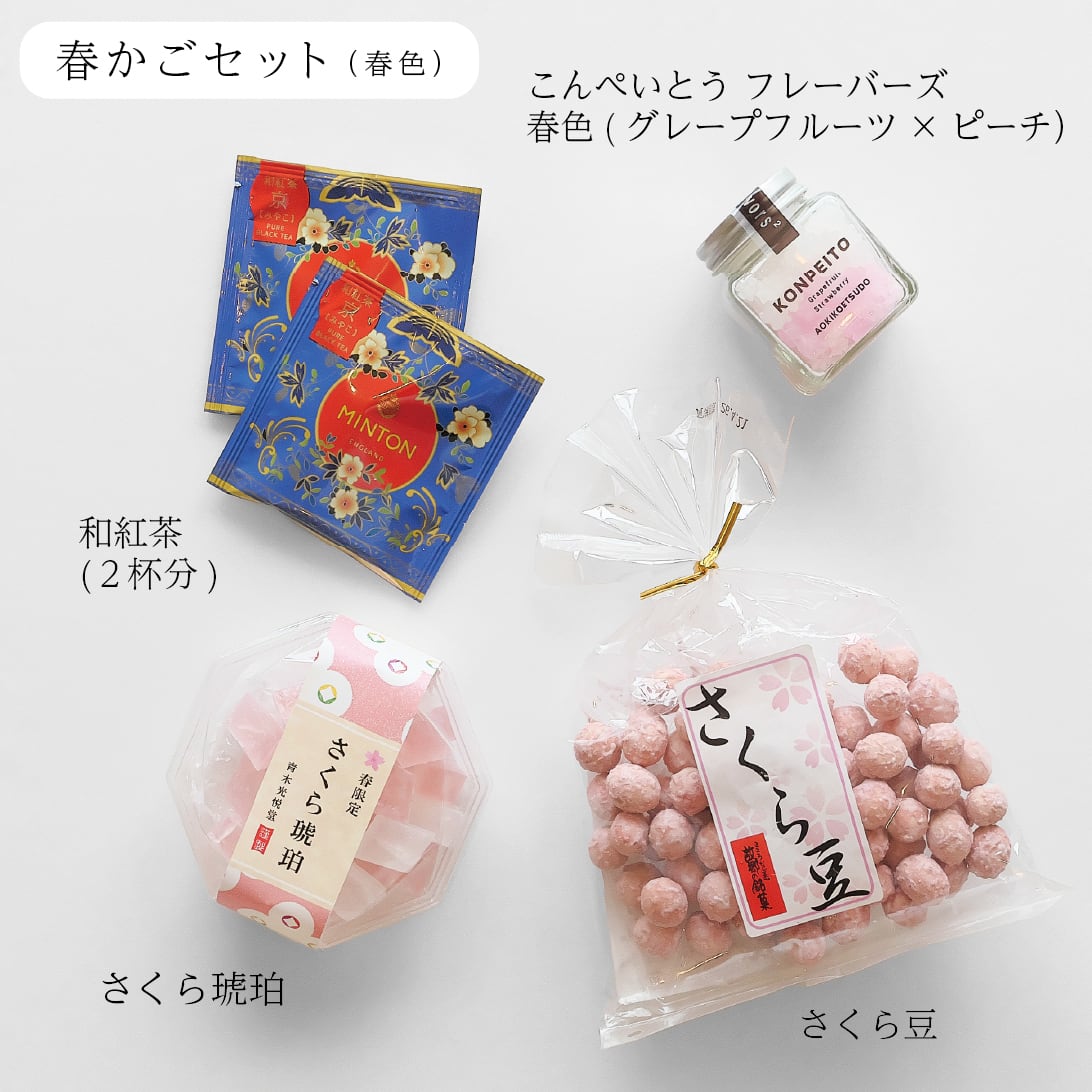 ■さくら豆:落花生(中国)、砂糖、餅粉、小麦粉、澱粉、桜葉パウダー、食塩/着色料(ラック)※同一製造ラインに於いて海老を含む製品を製造しております。※製品表面にある濃緑色の部分は、桜の葉末であり異物ではありません。 ■春限定 さくら琥珀:砂糖(国内製造)、桜の花抽出物シロップ、ピーチペースト、寒天/クチナシ色素、ベニコウジ色素、香料、酸味料、(一部にももを含む) ■春限定 金平糖:◎グレープフルーツ:グラニュー糖(国内製造)/香料 ◎ピーチ:グラニュー糖(国内製造)/香料、着色料(赤色3号) ■ドリップコーヒー:【フレンチロースト】コロンビア産、ブラジル、他 【モカブレンド】エチオピア、コロンビア、他 ■京の和紅茶 京 (みやこ):紅茶(京都産)