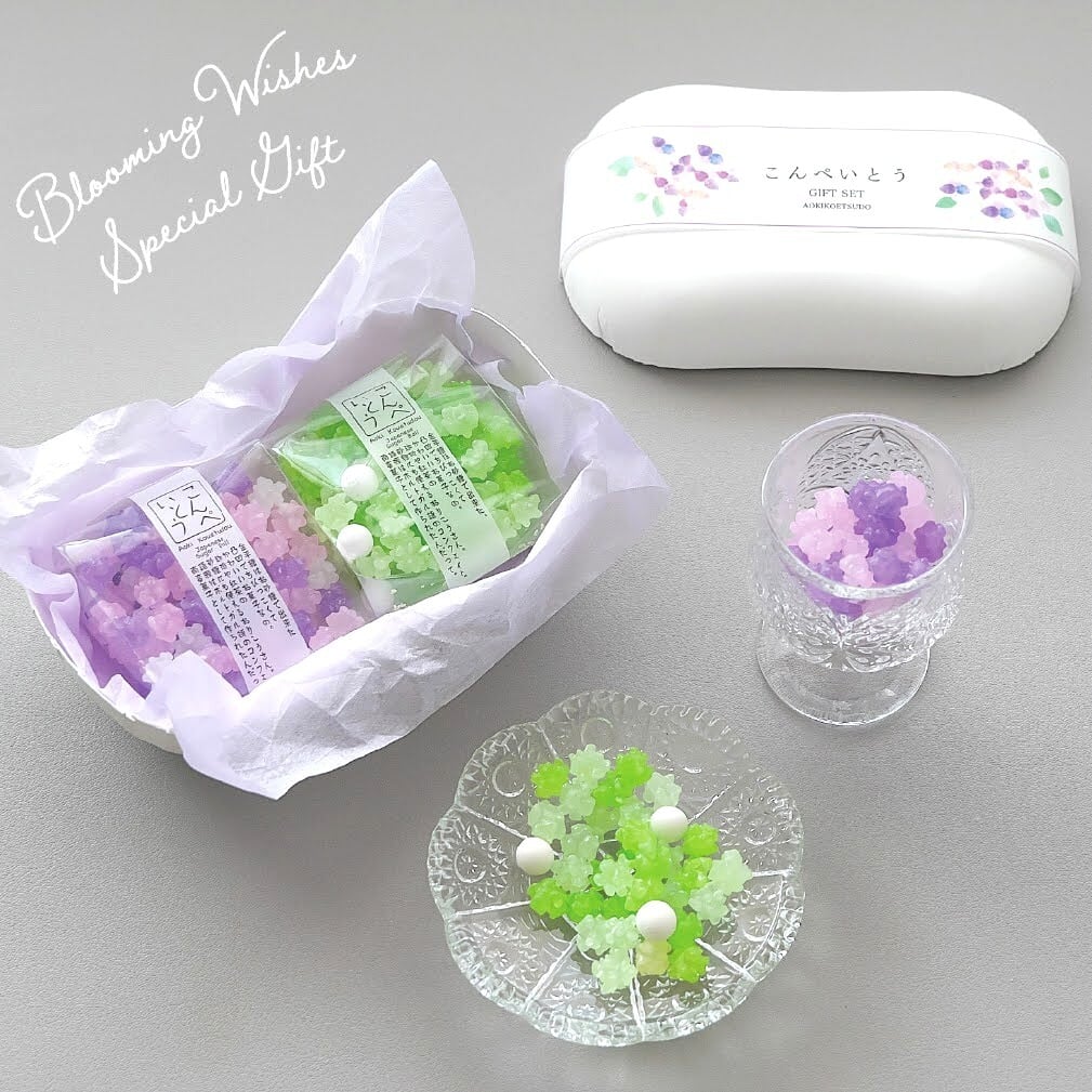 梅雨のやわらかな光を閉じ込めたような、金平糖ふじと金平糖すずらんのセット。紫陽花の花言葉「家族団らん」をイメージし、日々の感謝をそっと伝える贈り物に仕立てました。