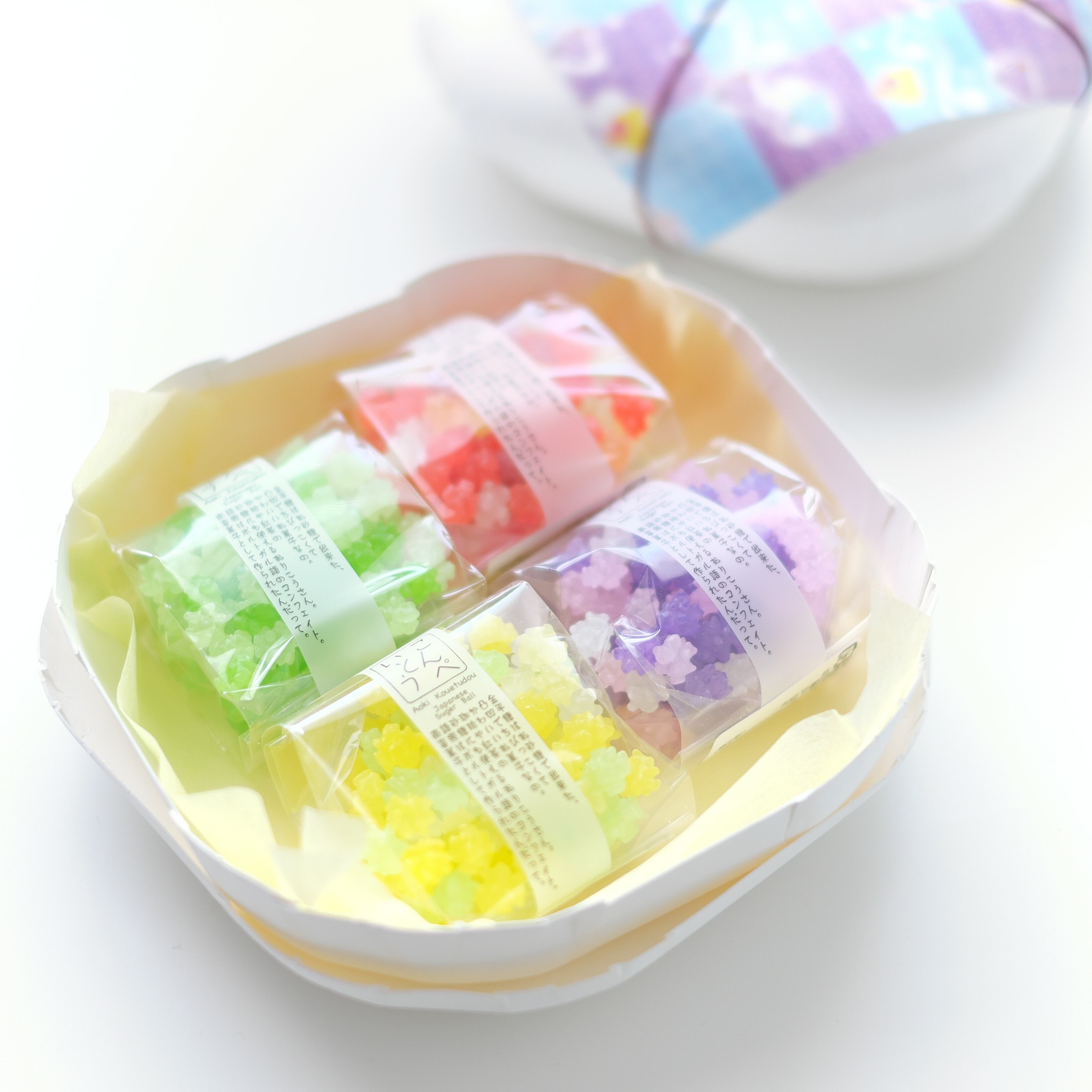 ■菜の花:グラニュー糖(国内製造)/香料、着色料(黄色4号、青色1号)■もみじ:グラニュー糖(国内製造)/香料、着色料(赤キャベツ、赤色102号、アナトー、黄色5号、黄色4号、青色1号) ■ふじ:グラニュー糖(国内製造)/香料、着色料(赤色3号、青色1号) ■すずらん:グラニュー糖(国内製造)、コーンスターチ/香料、着色料(黄色4号、青色1号)、増粘多糖類、タルク、光沢剤