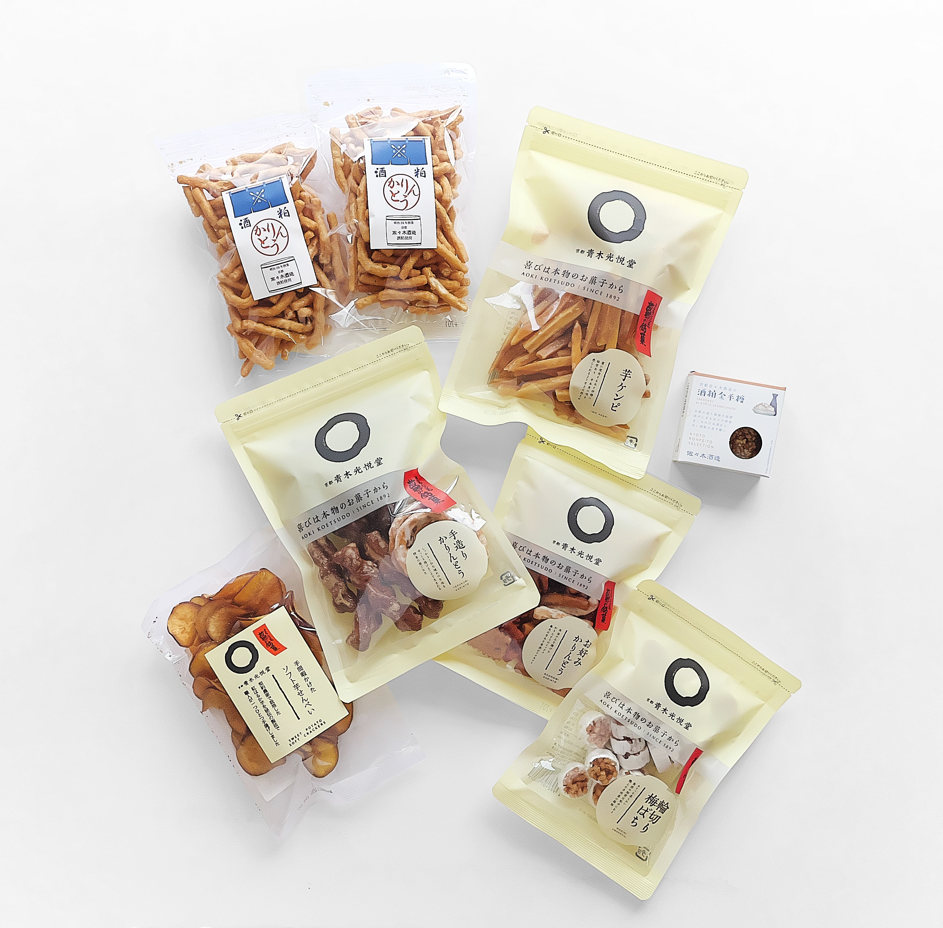 ■酒粕かりんとう:小麦粉(国内製造)、砂糖、植物油(米油)、酒粕、水飴、米粉、ショートニング、イースト、食塩 ※本品製造工場では乳製品・落花生・ごま・大豆・ゼラチンを含む製品を生産しています。 ■手造りかりんとう:小麦粉(国内製造)、糖類(砂糖、水飴、黒砂糖)、植物油脂、ごま、ショートニング、粉末鶏卵、大豆たん白、食塩、イースト/カラメル色素、膨脹剤※本製品工場では、落花生・そば・乳製分・かにを使用した製品を製造しています。 ■お好みかりんとう:小麦粉(国内製造)、砂糖、植物油、水飴、澱粉、ショートニング、黒胡麻、蜂蜜、あおさ粉、イースト、ゼラチン、食塩 /着色料(紅麹、クチナシ、カロテノイド、カカオ)、膨張剤 ※本品製造工場では乳成分・落花生・大豆を含む製品を生産しています。 ※蜂蜜を使用しておりますので、1歳未満の乳児には与えないでください。 ■輪切り梅鉢:砂糖(国内製造)、小麦粉、水飴、植物油脂、イースト、食塩 ■芋ケンピ:砂糖(国内製造)、小麦粉、卵、生姜、食塩/膨張剤 ■手間暇かけた ソフト芋せんべい :さつま芋(国産)、砂糖(さとうきび)(種子島産)、食用米油(国内製造)※本品製造工場では小麦・りんごを含む製品を生産しています。 ■京都佐々木酒造の酒粕金平糖:グラニュー糖(国内製造)、酒かす