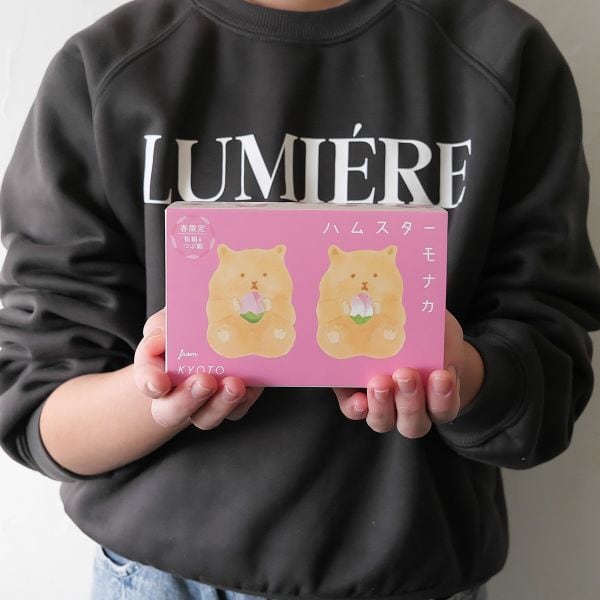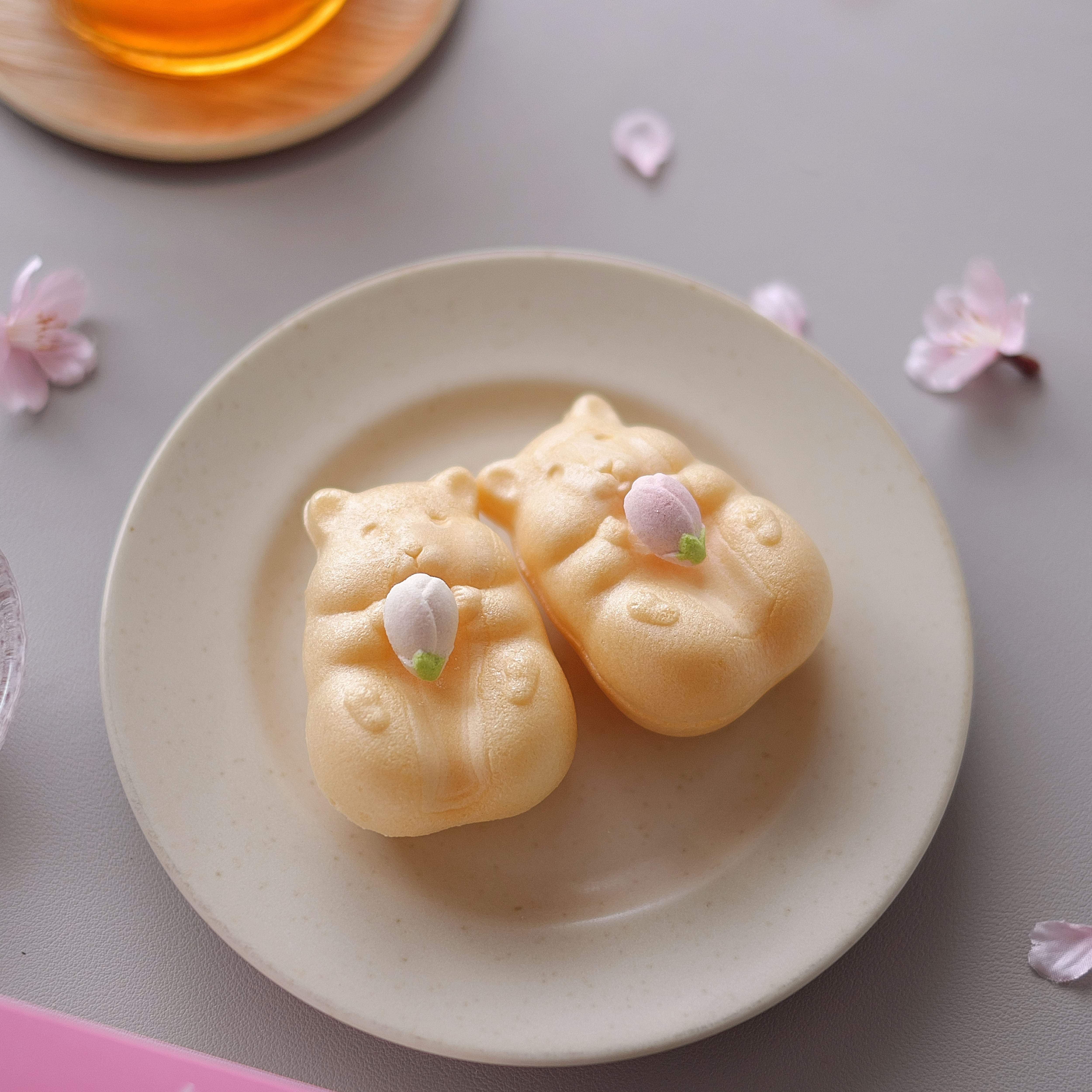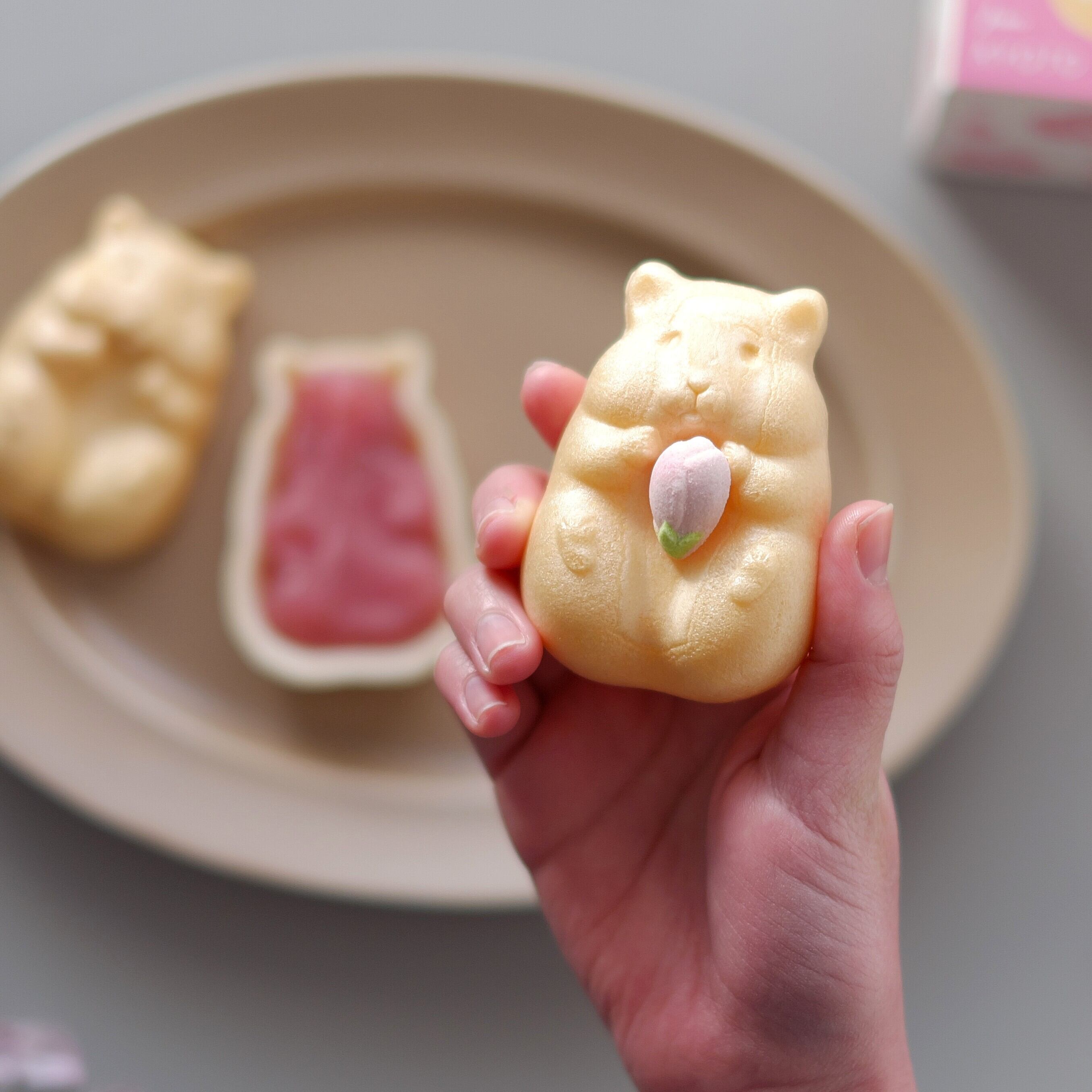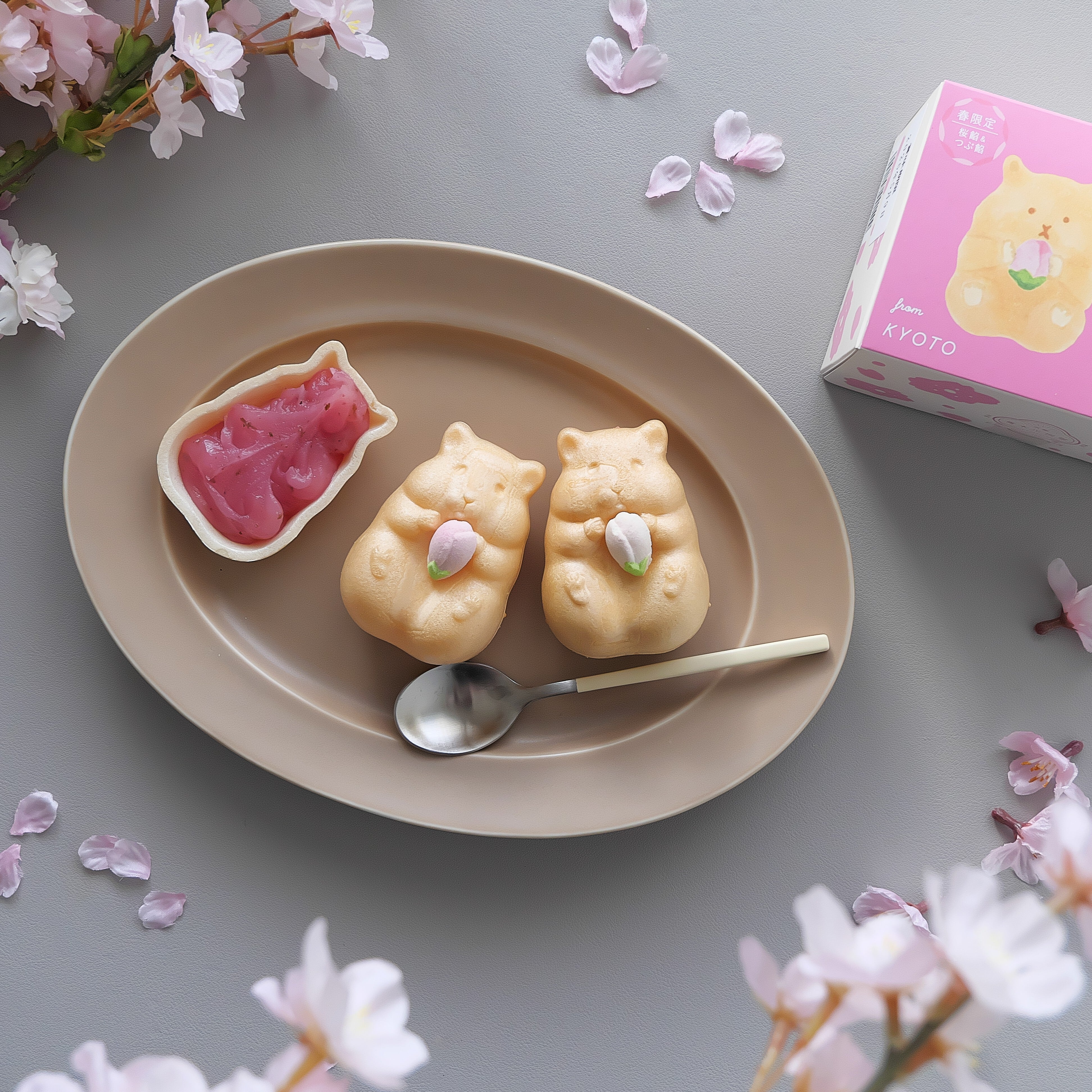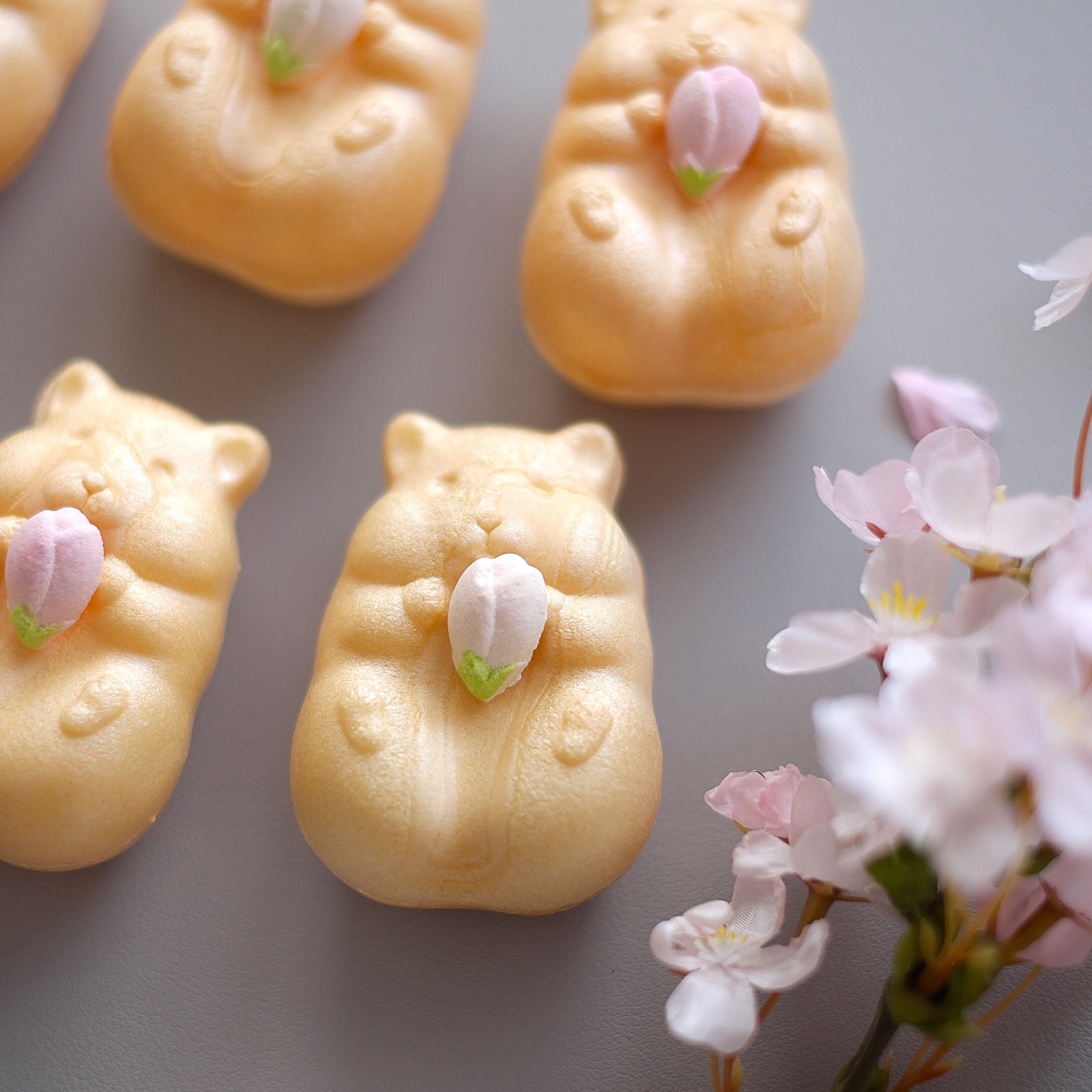 あっさりした甘さの桜餡もしくは北海道産つぶ餡をご自身でおなかの中にいれてセット。ハムスターのおなか部分が少しくぼんでおり付属のらくがんを置くと、まるでハムスターが桜の花を持っているよに見えて一気に春の装いに!!