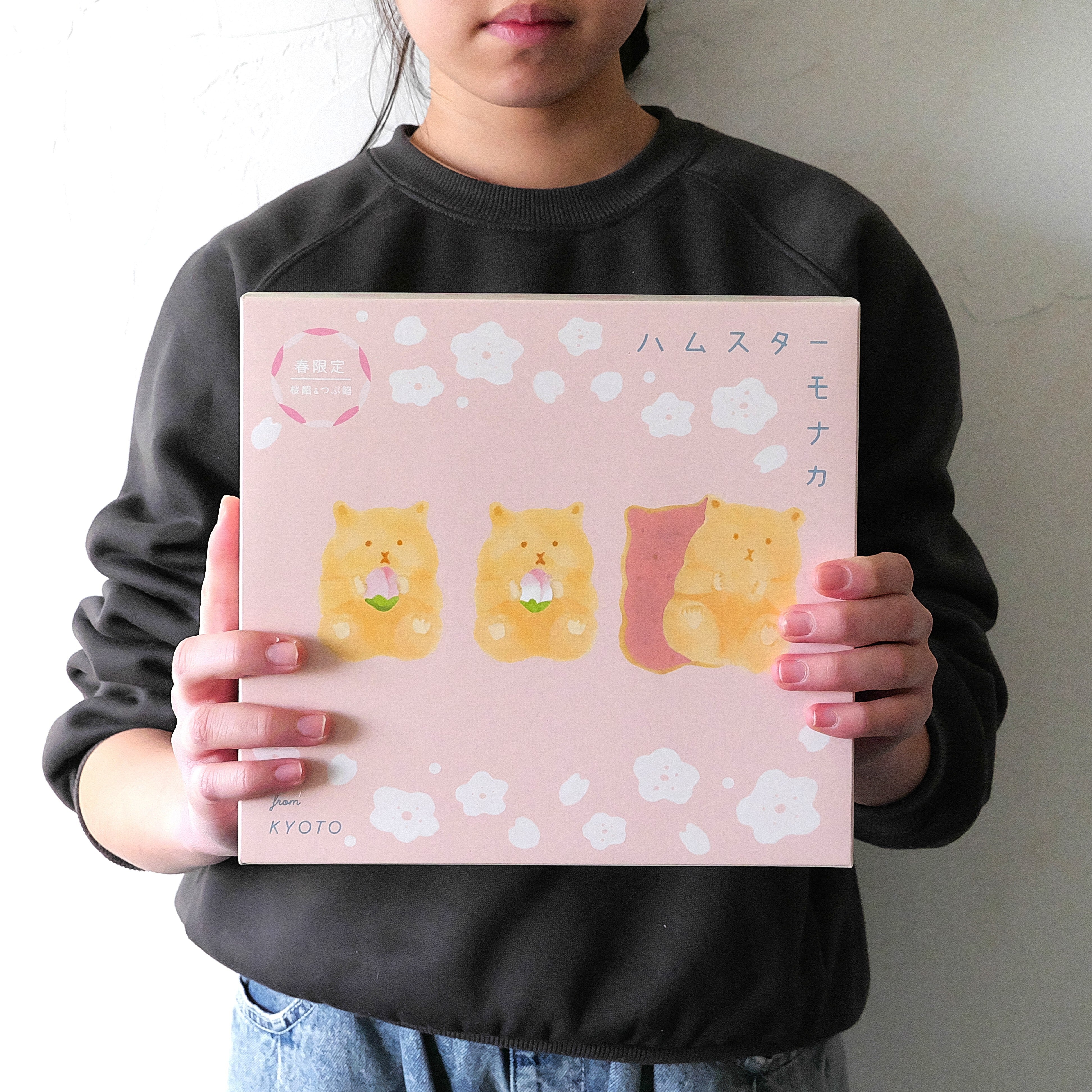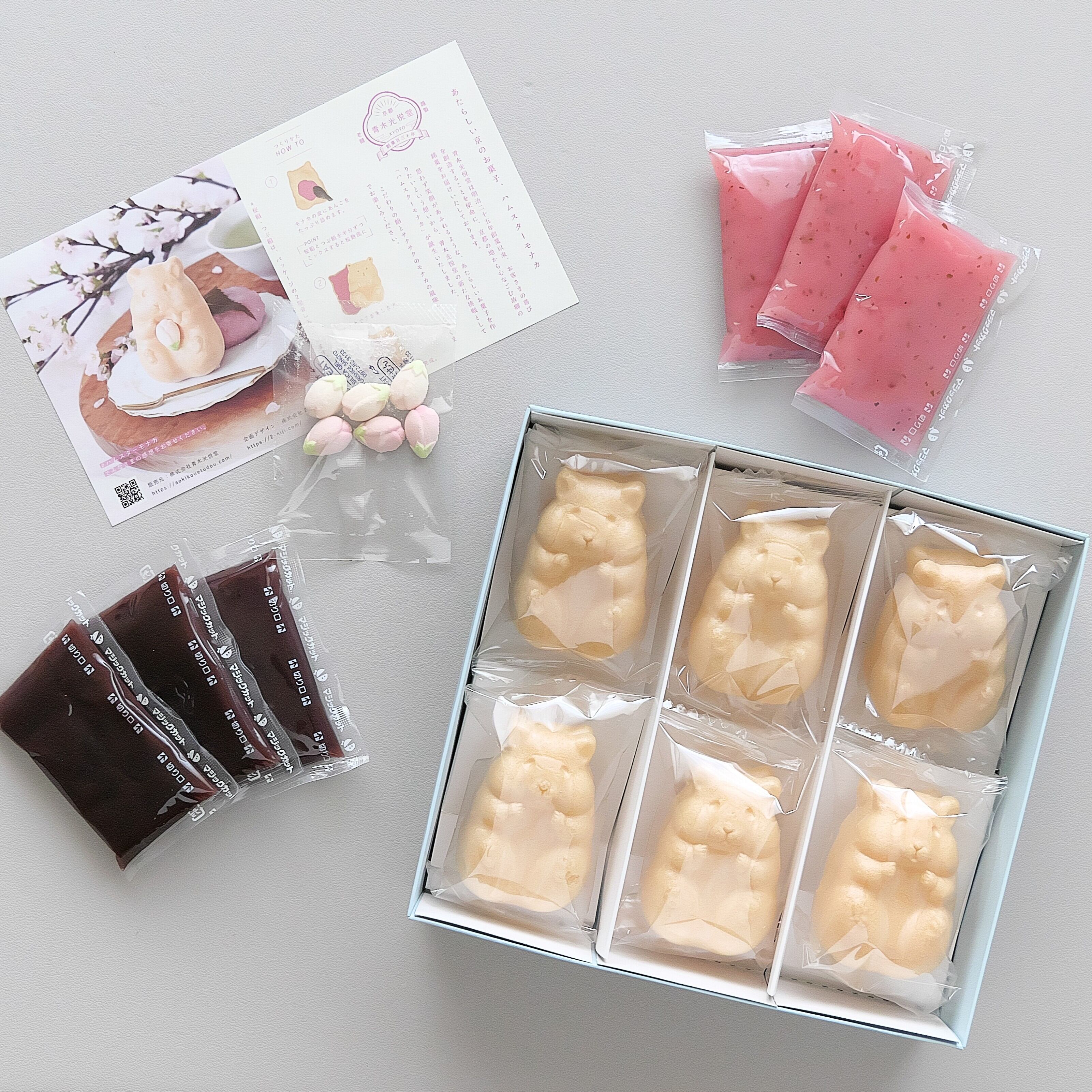 あっさりした甘さの桜餡もしくは北海道産つぶ餡をご自身でおなかの中にいれてセット。ハムスターのおなか部分が少しくぼんでおり付属のらくがんを置くと、まるでハムスターが桜の花を持っているように?えます。