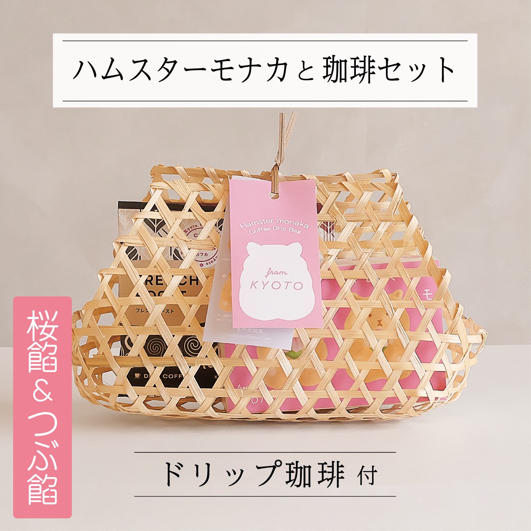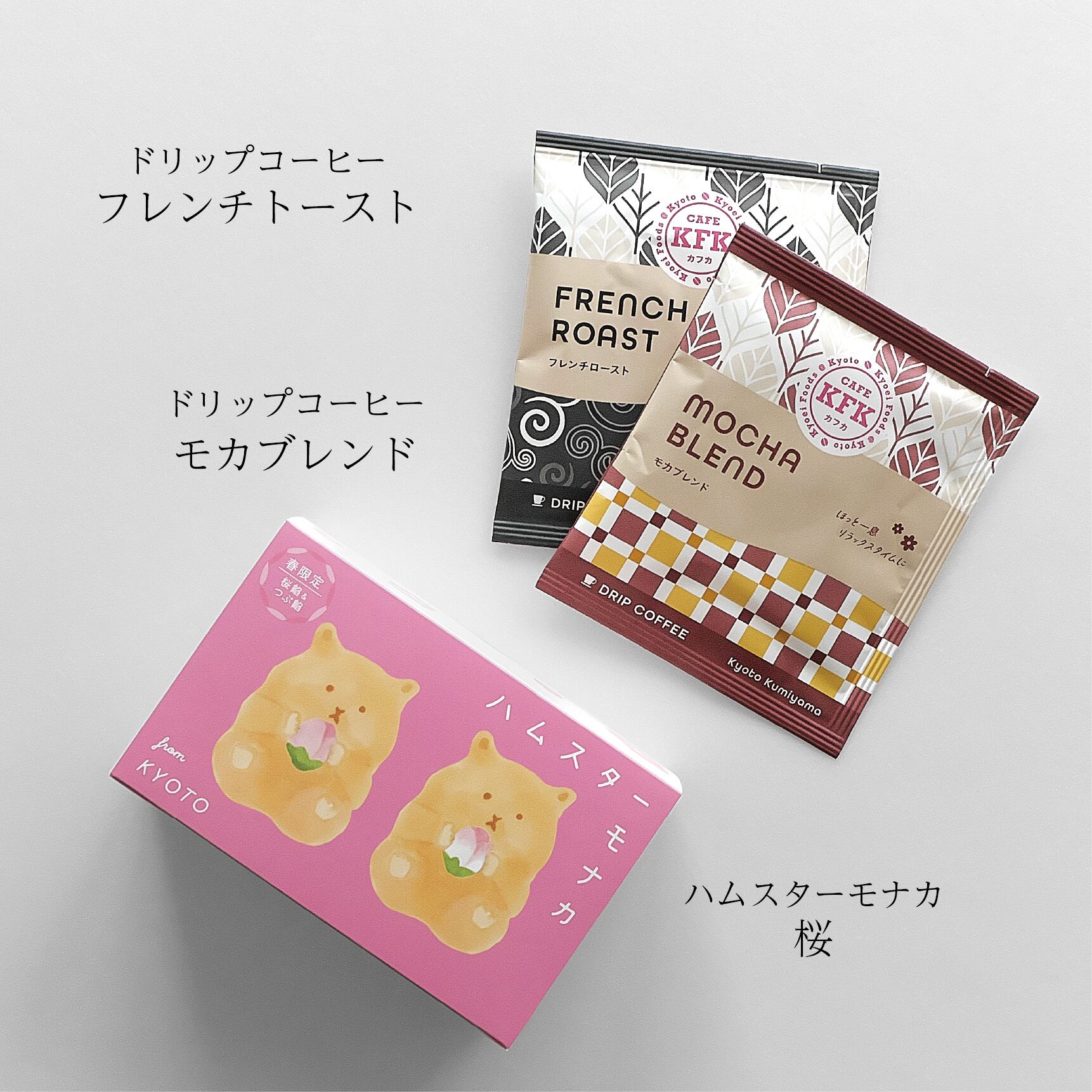 ■最中種 もち米(富山県、石川産)■桜餡 白生あん(国内製造)、砂糖、還元水飴、桜葉塩漬、リキュール、寒天/グリシン、ミョウバン、pH調整剤、酸味料、着色料(赤106、赤3)、香料■北海粒餡 砂糖(国内製造)、小豆(北海道産)/グリシン■らくがん 和三盆糖(国内製造)、上白糖、寒梅粉ミックス(もち米、ワキスターチ、コーンスターチ)、馬鈴薯澱粉/ソルビトール、着色料(ラック、黄4、青1)※原材料に小麦粉は使用しておりません。本製品の製造工場では、卵、小麦、そば、落花生、乳成分を使用した製品を製造しております。■ドリップコーヒー:【フレンチロースト】コロンビア産、ブラジル、他 【モカブレンド】エチオピア、コロンビア、他